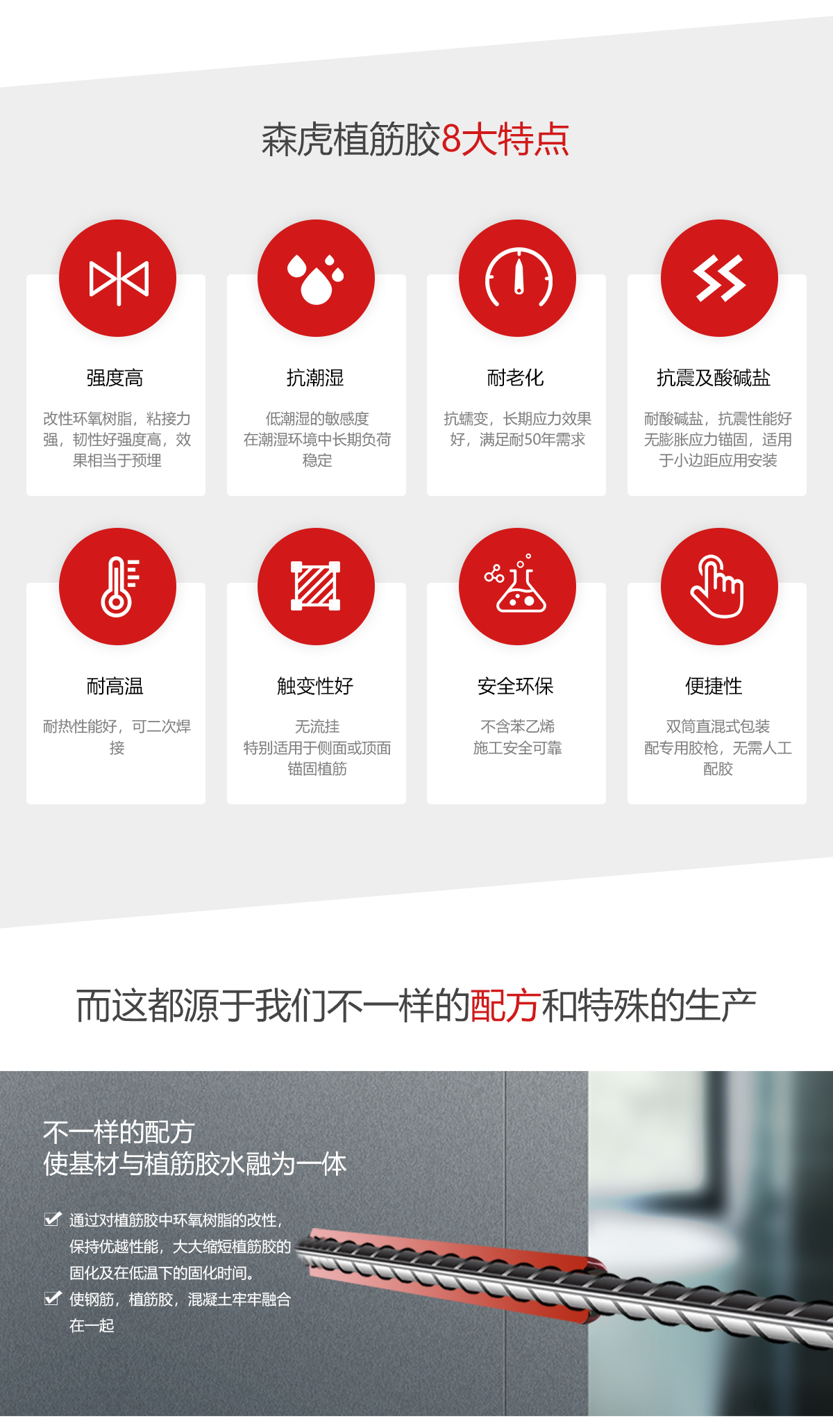產(chǎn)品性能 植筋技術(shù)是采用高強(qiáng)度的化學(xué)膠粘劑使鋼筋、螺桿等與混凝土產(chǎn)生超強(qiáng)錨固力,從而達(dá)到預(yù)埋件效果。施工后產(chǎn)生高負(fù)荷承載力,不易產(chǎn)生移位、拔出,并且耐水、耐堿性良好,無需作任何防水處理。由于其通過化學(xué)粘合固定,不但對基材不會產(chǎn)生膨脹破壞,而且對結(jié)構(gòu)有補(bǔ)強(qiáng)作用。施工簡單迅速,安全并符合環(huán)保要求。 產(chǎn)品特點(diǎn): 1.雙組份配比,環(huán)保,不含苯乙烯。 2.耐水、耐凍融、抗酸堿、耐老化、耐熱防火、溫度敏感底與混凝土親和力好,相當(dāng)于預(yù) 埋件效果。